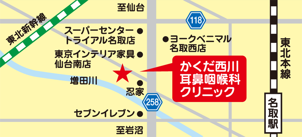 岩沼方面から仙台長町方面に向かって来られる場合、名取駅を通り越し次の信号手前左側にある忍屋さん(居酒屋)の角を左手にお曲がり下さい。